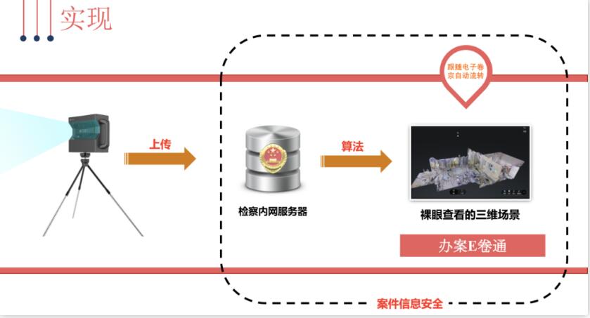 VR全息复刻系统,利用专用设备对现场进行实景扫描,采集信息后上传至检察内网服务器,由后台算法将图像及相关空间参数生成可裸眼查看的三维场景。三维场景将通过案件ID随案流转,依权限供办案人员在各环节使用,不断放大一体效能。