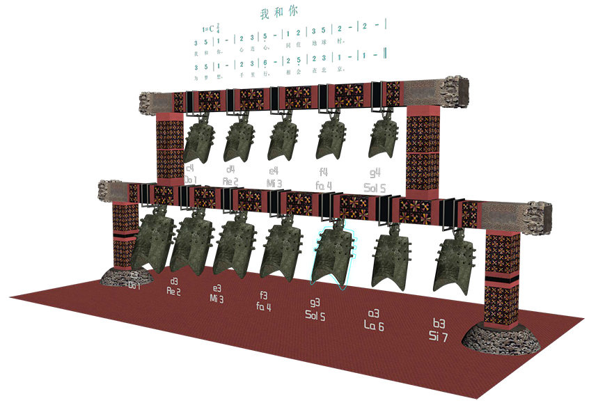该场景中呈现整套编钟 , 编钟上方处会呈现 《我和你》的乐谱,学生可根据乐谱进行演奏。