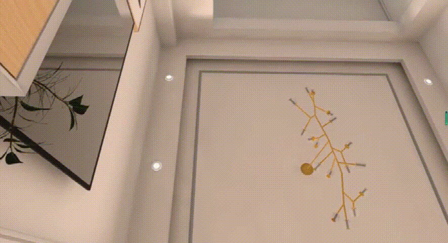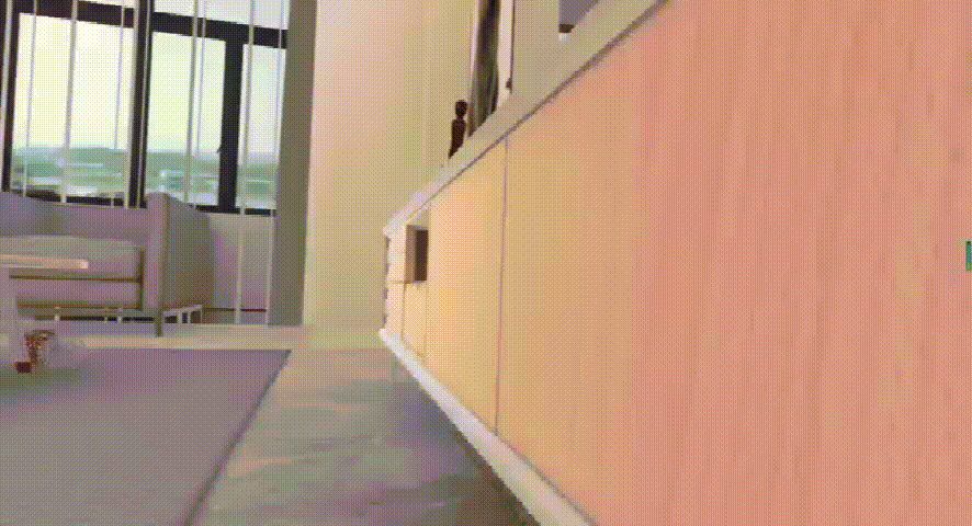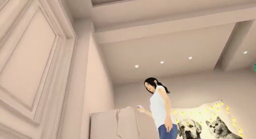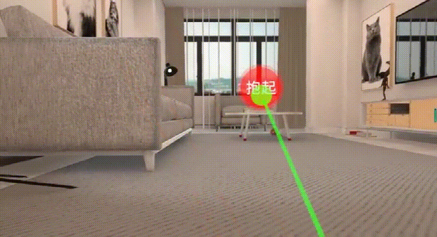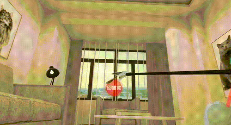 点击“抱起”按钮,模拟抱起猫咪,视线上升;点击“跳下”按钮,回到猫咪在屋内的视觉高度;
