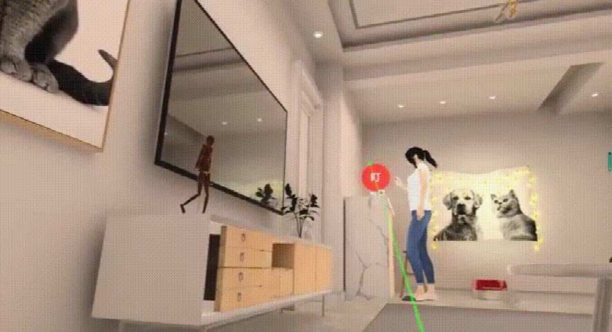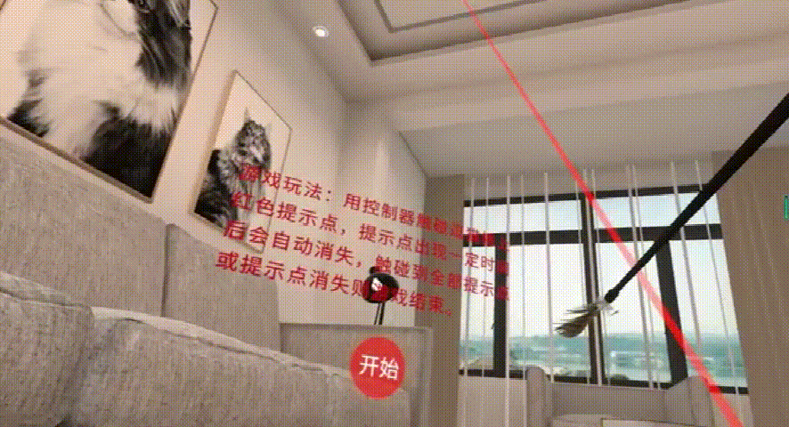 逗猫棒逗猫互动,游戏玩法:用控制器触碰逗猫棒上的红色提示点,提示点出现一定时间后会自动消失,触碰到全部提示点或提示点消失则游戏结束。