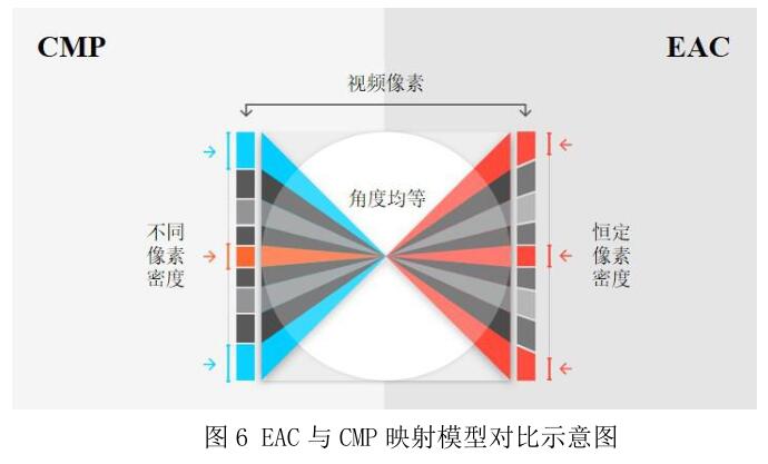 EAC 等角方块映射投影法的目标是不论取样样点在映射面的什么位置,都能保证观看者在各处获得统一的像素观看密度感。EAC 映射模型在 6 个映射面上,各角度内的像素密度是保持恒定不变的。EAC 与 CMP 映射模型的对比示意图如图 6 所示。