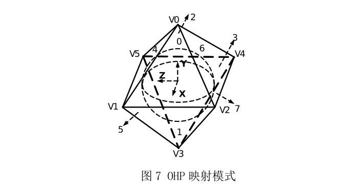 OHP 映射模型有 8 个三角形的映射面和 6 个顶点,OHP 模型不同于 CMP 模型的特殊之处在于它包含三角形的映射面。三角形映射面需要仔细处理以保证面与面交界处的视觉连续性以及编码效率提升,如图 7 所示。