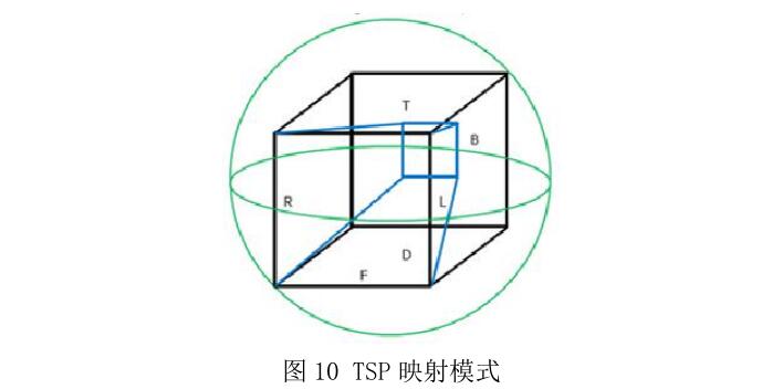 TSP 映射模型使用顶端截断的金字塔形的立方体几何模型,并将该立方体的六个面整合形成一个紧凑的矩形帧。观看正面是一个整形的正方形,观看侧面和背面则逐渐缩小,如图 10 所示。