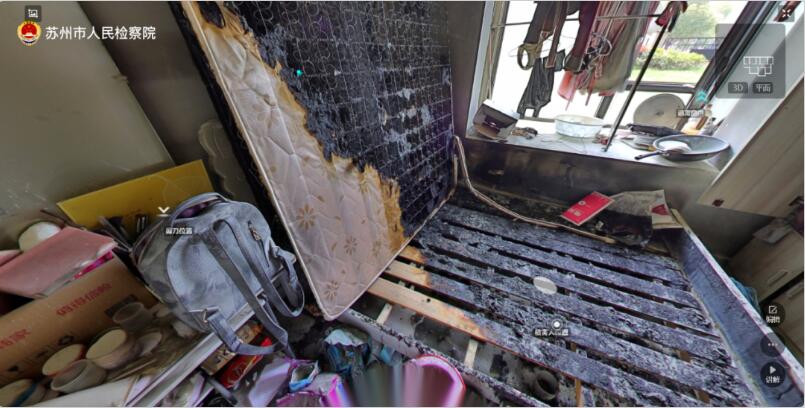 由于这起杀人案件发生在一个群租房中,案发时部分房间已被整改拆除,现场布局较为复杂。检察技术人员通过VR全息复刻技术,生成案件现场三维模型,案发现场中剪刀的提取位置、房间的过火痕迹、门口来不及收拾的被告人的行李都一一准确复刻。