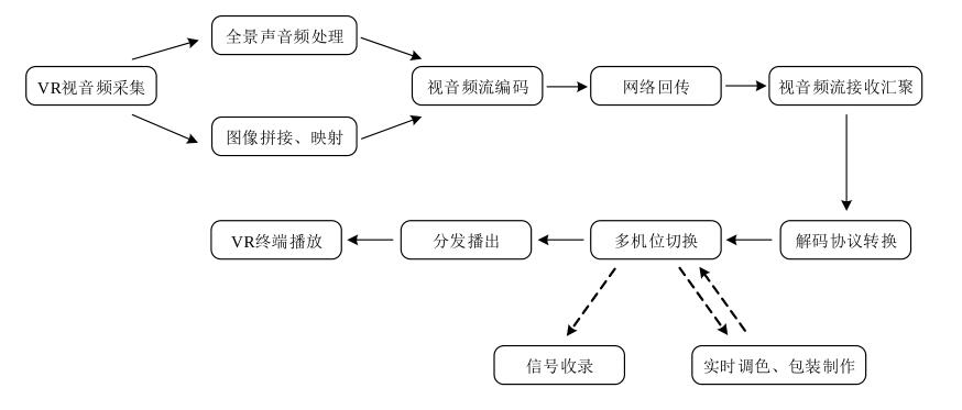通过提炼总结 VR 视频拍摄制作过程的关键工作节点,形成 VR 视频拍摄制作工艺流程。当前 VR 视频业务主要分为直播和录播、点播两类场景,两种场景分别对应不同的工艺流程。