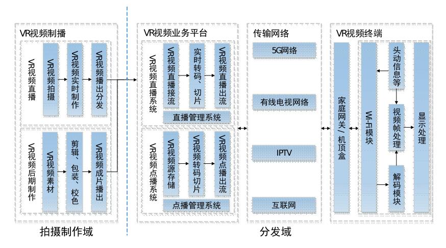 VR 视频业务平台包括 VR 视频直播系统和 VR 视频点播系统两部分。在直播管理系统和点播管理系统的基础上,VR 直播流和 VR 视频源通过转码、切片后形成播出流,随后推送至传输网络。