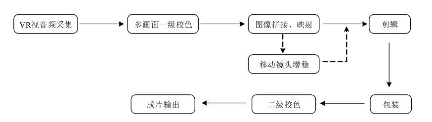 对于录播和点播场景,VR 视音频采集后对画面进行一级调色,调色后的 VR 图像经过拼接、映射、移动镜头增稳等处理后,依次进行剪辑、包装和二级调色,最后输出成片,用于后续录播和点播使用。面向录播和点播的 VR 视频拍摄制作工艺流程如图 所示: