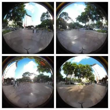 后来很快就发明了鱼眼摄像机,也就是像凹凸镜一样可以拍摄广角镜像,最后二维上呈现一个圆形畸变图片。这样只需要几张图就能实现拼接。但是球形图对于影视后期制作非常不方便。