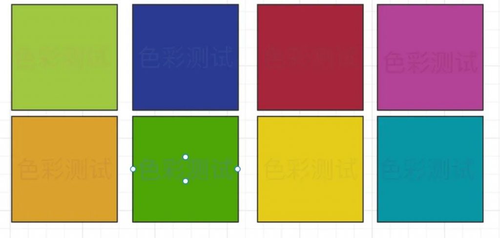 在色彩模块,我们放置了18个色块。(24色卡中的#1~#18色块)色块上写有“色彩测试”字样(选中区域)。颜色与底色相近,文字与底色deltaE约为2。用以验证色彩区分度。如果无法看到色彩测试字样。说明色彩表现能力较弱。
