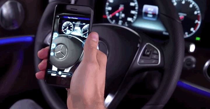 首先,您需要购买或者租用 2018年的奔驰 E 级或 S 级高级轿车,然后从 iOS 商店下载 Ask Mercedes 应用程序。下载到您的手机后,只需启动程序并选择“探索我的功能”即可。这将调出手机的摄像头扫描您的奔驰内部,并将的AR标志对准车内的特定部分就会出现信息标识。点击任何这些信息标识将以指导视频的形式或通过数字版本的用户手册访问对应特定组件的信息。