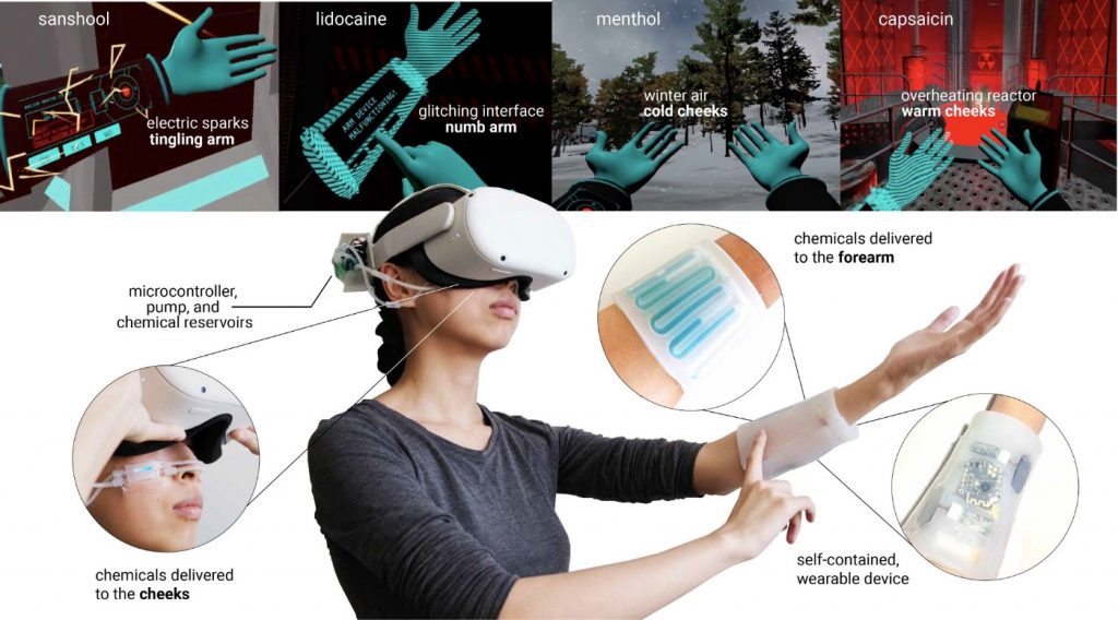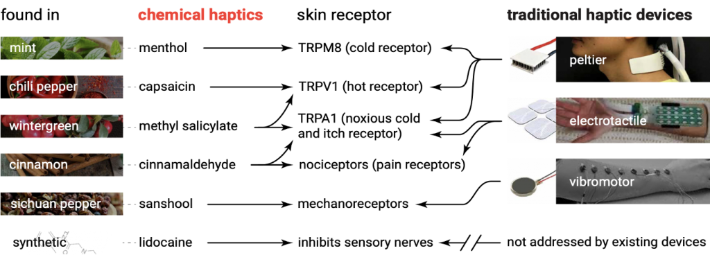 由芝加哥大学实验室的研究员提出的化学触觉技术,通过液态刺激物刺激皮肤表面以实现多种触觉感知。目前以研究出5个能帮助持续产生感知的化学物质,能产生刺痛感的山椒素和肉桂醛,产生麻木的利多卡因,产生温暖的辣椒素,产生凉爽感的薄荷醇。